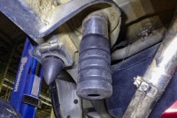 純正取り付け位置でどの角度も万能に受け止めるのは構造的に難しいのですが、コイルスプリングの中に付ける事によりコイルスプリングがサポートし、どのような状況でもホーシングに真っ直ぐ当たるようになります。度重なる衝撃を受けて割れたりもげたりした場合でも粉々にならない限りはコイル内に残りバンプの機能を失いません。