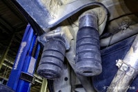 純正位置に付けた大容量バンプラバーの場合、両輪縮んだり、片方だけ縮んで反対は伸びていたりと複雑な動くをするホーシングの当たり角度によっては真っ直ぐに当たらずに逸れたりしてバンプの機能をしなかったり、最悪はもげてしまったりする事があります。