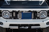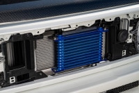 オイルクーラーコアの取り付け位置をトラスト製標準位置のフロントバンパーロアグリル内側からフロントグリル開口部内側へと上部に移設。路面や障害物からのヒットを避け損傷を防ぎます。